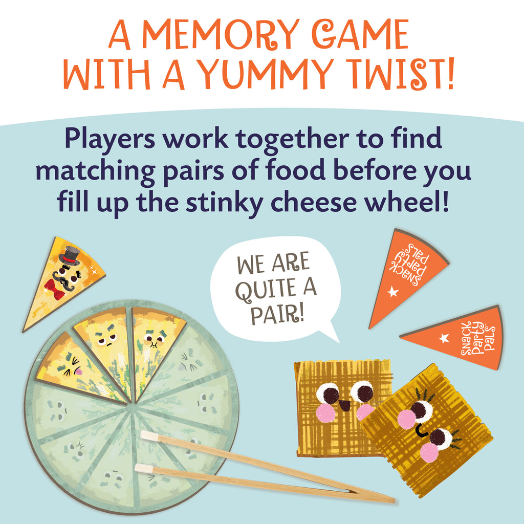 Test your memory and teamwork as you flip snack wedges with tongs, hunting for matching pairs of delicious foods to fill your board. Beware the sneaky stinky cheese wedges hiding in the mix—reveal too many and the party's over! Race against the cheese to match all 13 tasty ingredients before defeat strikes. The magic cheese wedge and spinning stinky cheese wheel keep the excitement rolling with every turn. Win together or lose together—that's the cooperative spirit!